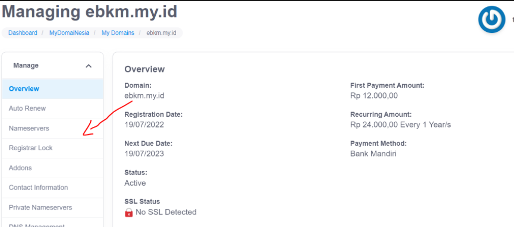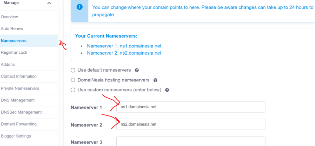 pilih domain yang sudah dibeli lalu arahkan ke Nameservers